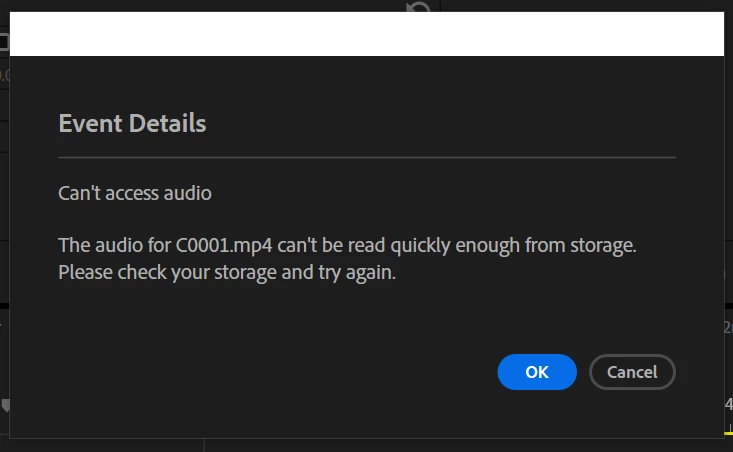 Just started getting this error window today while working on a very simple project that only has a couple After Effects motion graphics clips, and three tracks of audio: VO, music, and light SFX:
