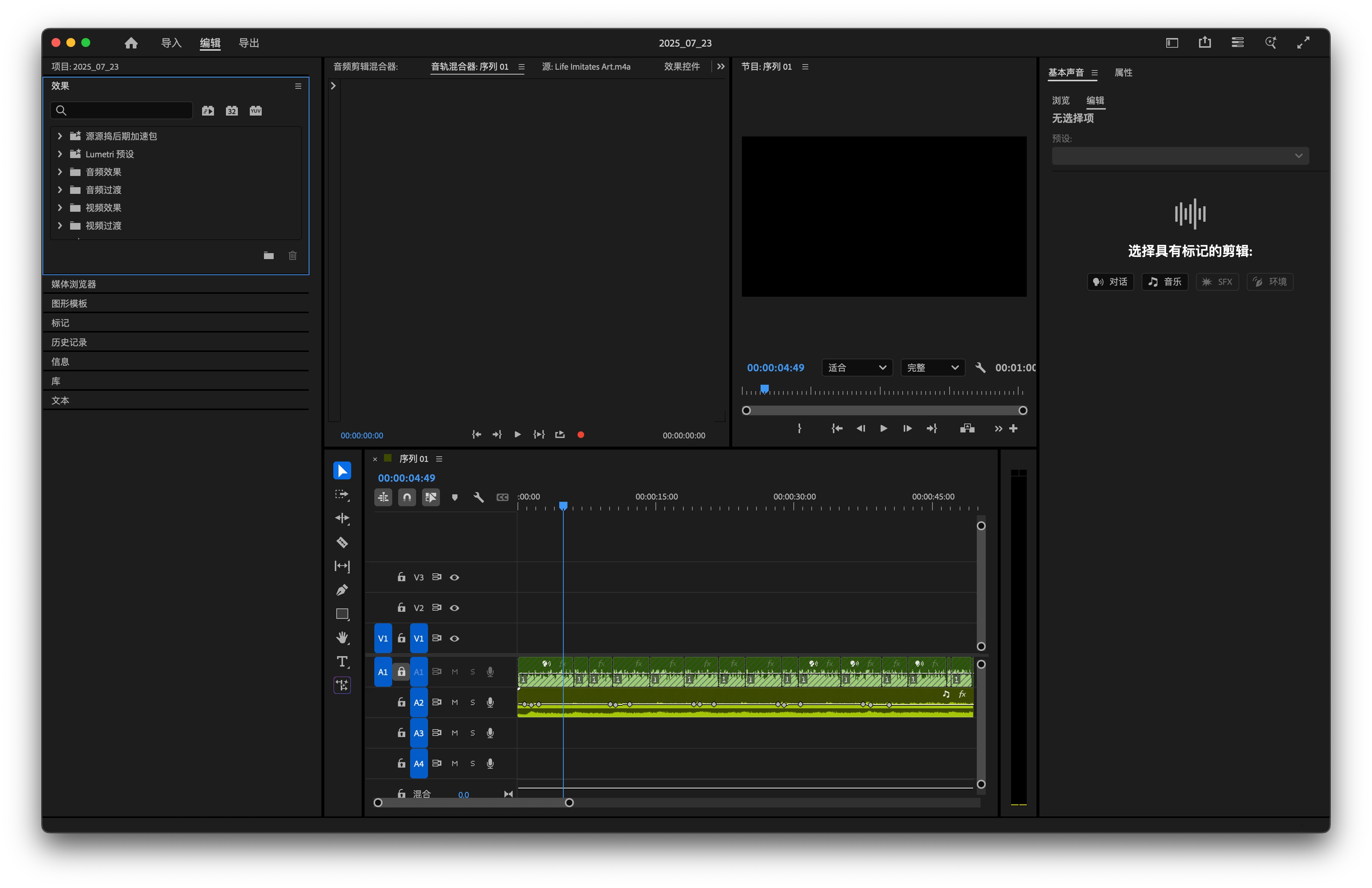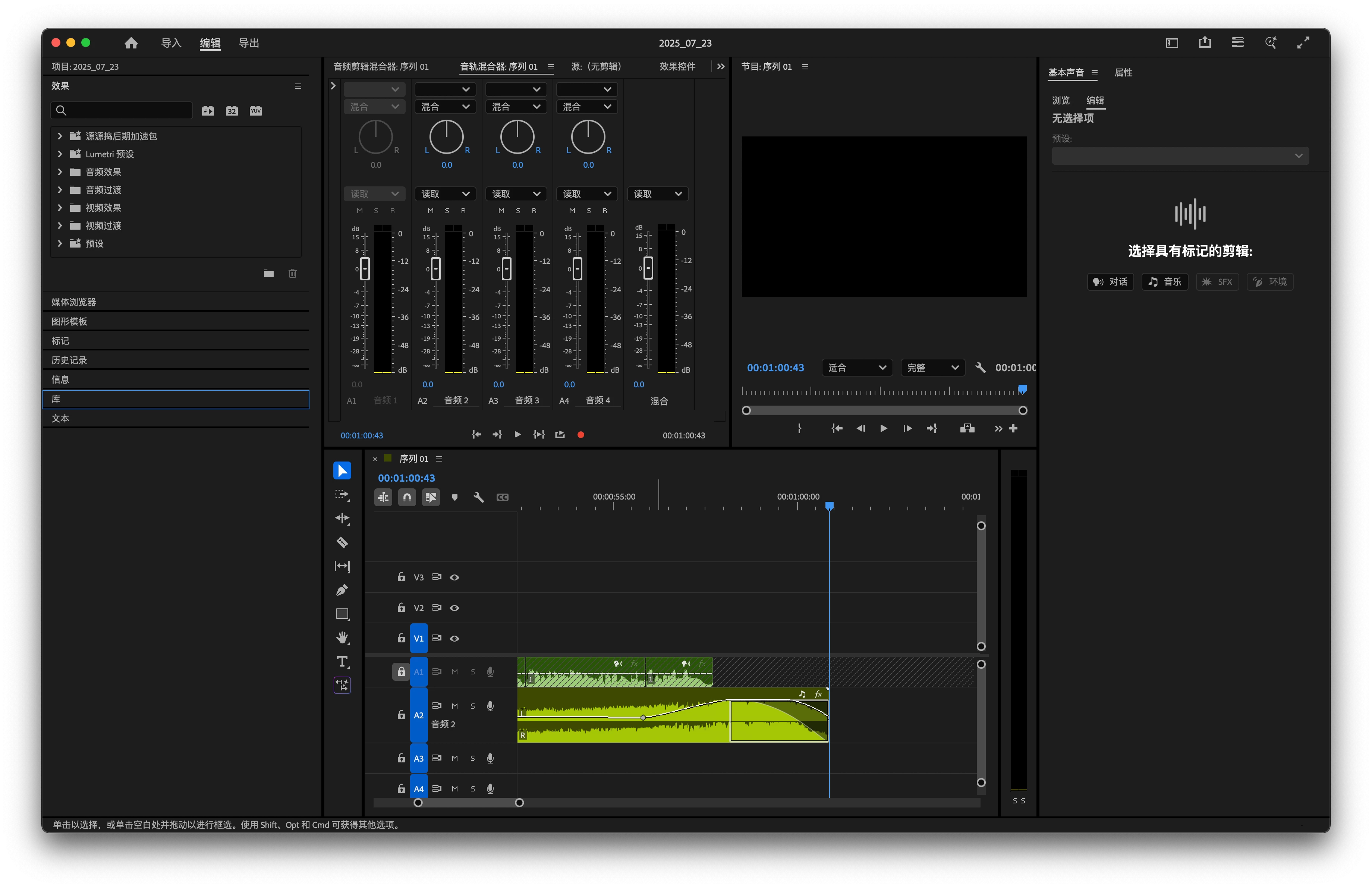 在一个项目中插入素材后第一次打开音频面板工作区时,音轨混合器无法显示。当你关闭软件,再打开一次音轨混合器才能正常显示。
