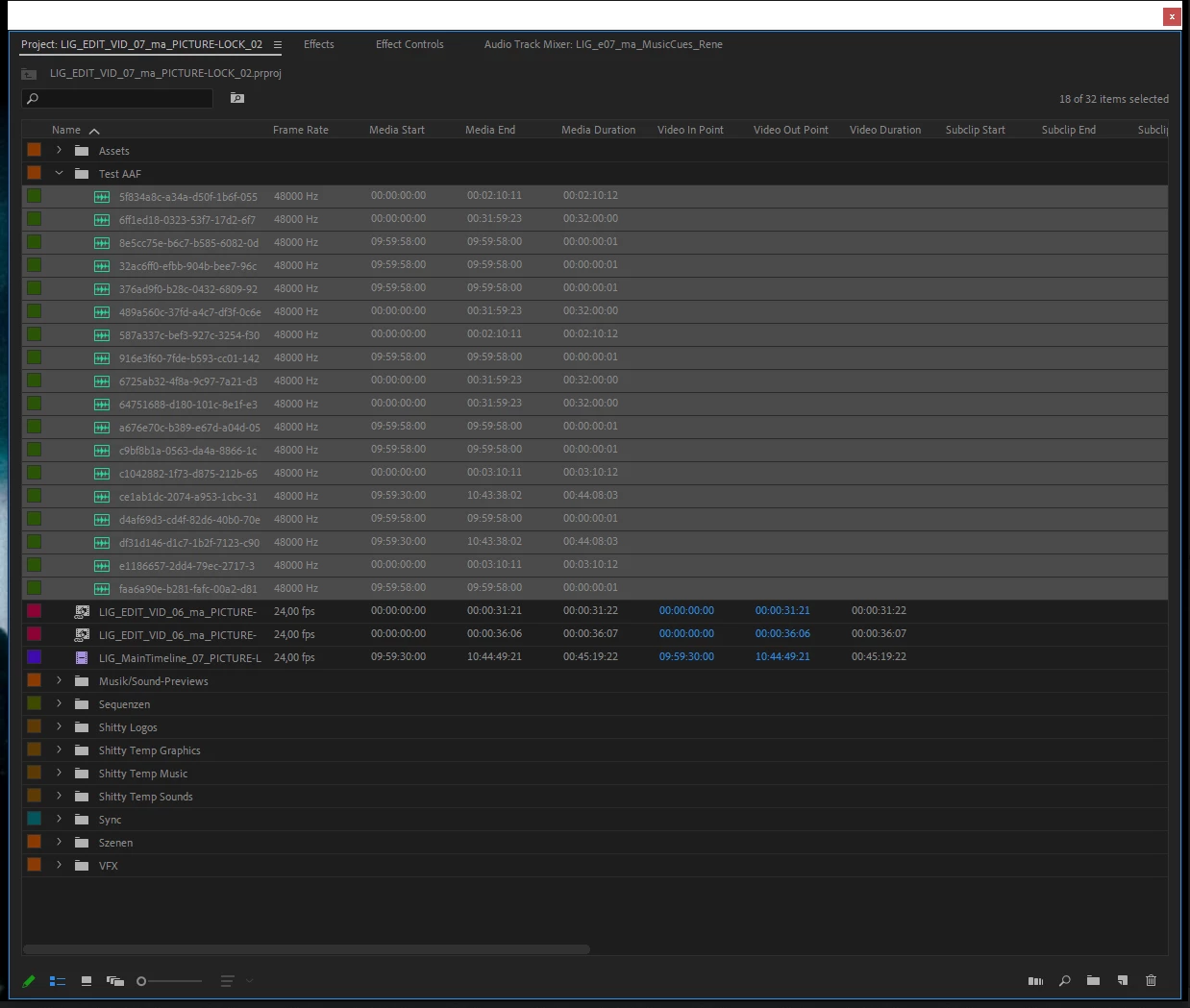 Als ich mit der aktuellen Premiere-Version 24.2.1, die ich am 23.02.2024 installiert habe, von meinem Filmprojekt nach Picture Lock einen AAF-Export gemacht habe, konnte der Sounddesigner die Timeline zwar in Pro Tools öffnen, aber die ISO-Tracks nicht zurückholen. Das lag daran, dass alle Metadaten nach dem Export weg waren. Start-TC war angeblich immer 00:00:00:00. In Premiere selbst waren die Metadaten der Audiofiles aber vorhanden und bei früheren Tests, wo wir AAFs exportiert hatten, ging auch alles. Das war aber vor dem Update von Premiere.