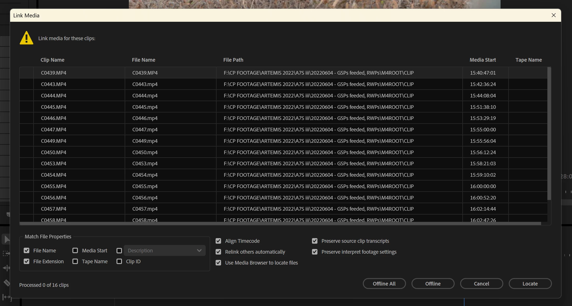 But something's changed, and now when searching for media, Premiere immediately goes to the highest level of the folder structure, and starts searching them one by one until it finds clips with the same name. This is completely the wrong way to go about it. It needs to STAY in the folder that's been specified, and find all the clips in there. Then, if there are still outstanding clips, it should notify the user and ask for a new directory, instead of automatically going to the top and picking the first file name that matches.