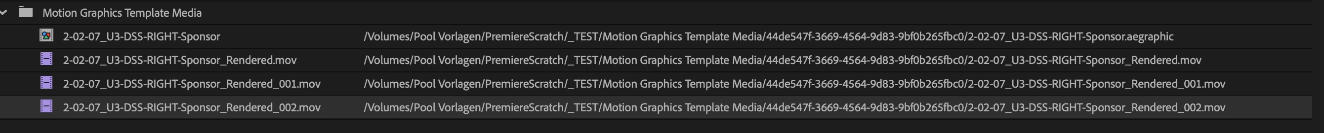 Using MOGRT in Timeline and changes e.g. text value. "Render and Replace" renders .mov-File with default values! After "Restore Unrendered" and again "Render an Replace" rendered .mov-File is correct. Using MOGRT multiply times in timeline "Render an Replace" always use same filename (not increasing) and replace files thats leads to error retrieving frames.