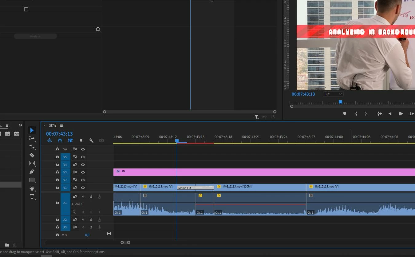 Hi All - Thanks for your input on this. I'm a long time Premiere user, first time trying Morph Cut. I used it on my first interview - all went well and looked great. Trying on a second interview, I can't get through the "Analyzing in Background" flag. My interviews are shot in 4K, edited in 1080p, static plain background. I tried the Render and Replace option which turned all transistions into cross-dissolves. That didn't look quite right, so I went back to replace all with Morph Cut. The first two cuts on the timeline look fine, but all the rest continue to "Analyize in the Background." The edited interview is less than 5 minutes. Morph Cuts are set to 10 frames. As I move through each transition frame-by-frame, the orange banner only shows up on two frames per transition.