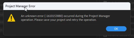 The issue occurs when I try to create a project from the Project Manager to share with my team. I even tried rolling back to the 2024 version, but the same error persists. I also tested this project on a different device, but the error still comes up.