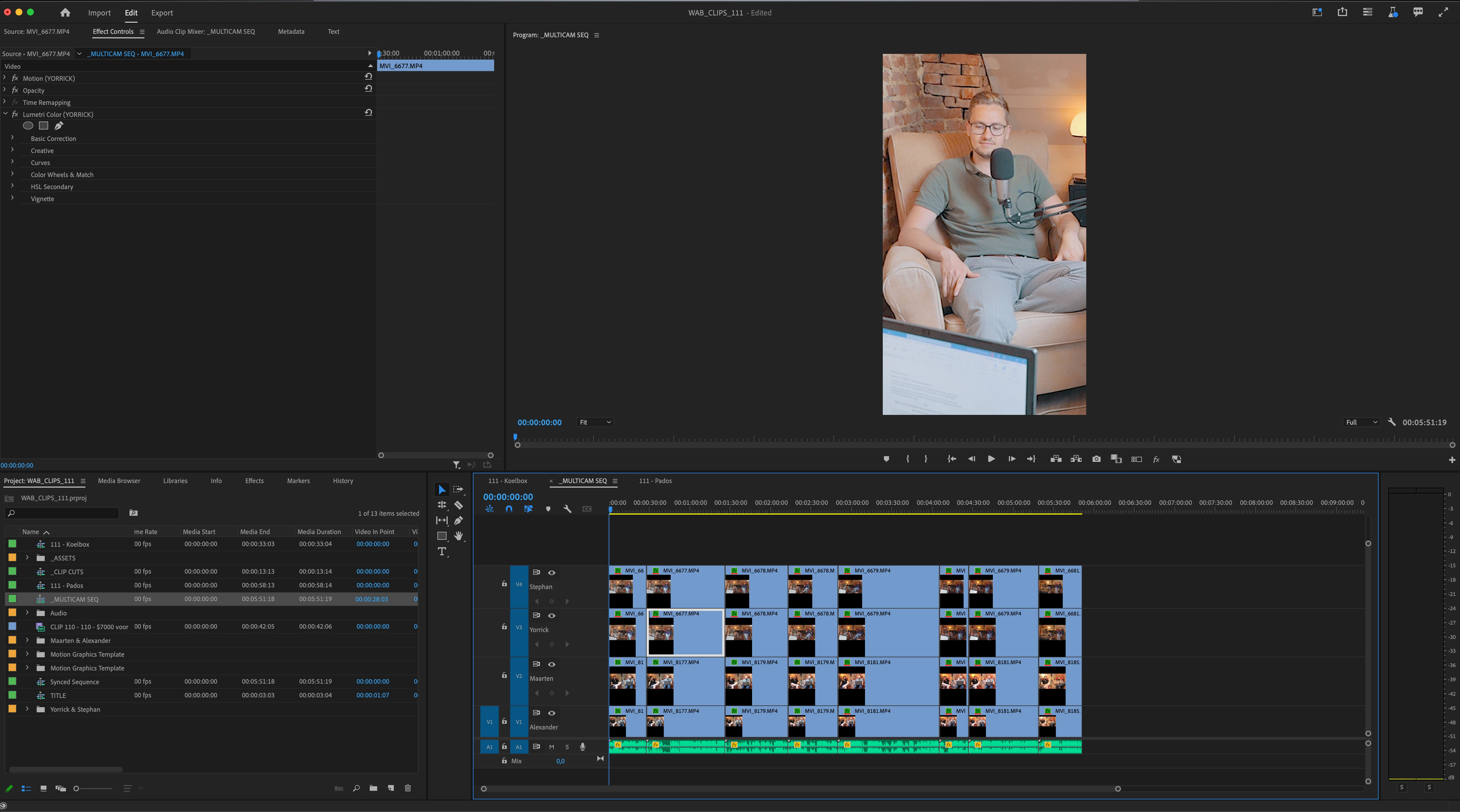 For this, I've recorded my footage with two cameras in 1080p 16:9, from which I isolate two angles in each shot. Thus, I've got four 9:16 shots of each host.