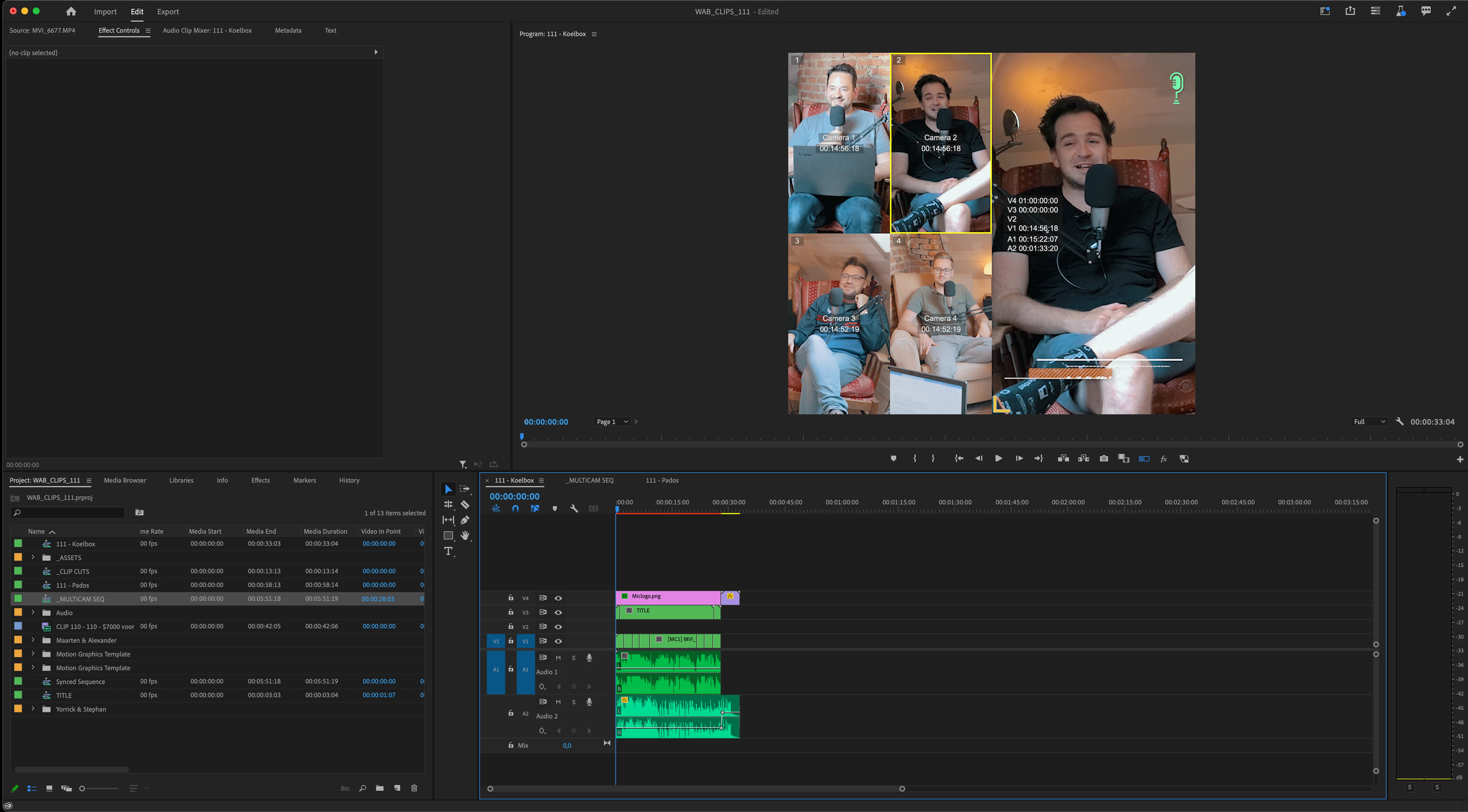 I drag the multicam clip onto my timeline and enable the multicam view in my Program Monitor window. Initially, I see the four shots on the left and my currently selected angle to the right, just as it should be. But as soon as I make a cut, the four preview angles disappear, and the selected camera centers in my Program Monitor window.