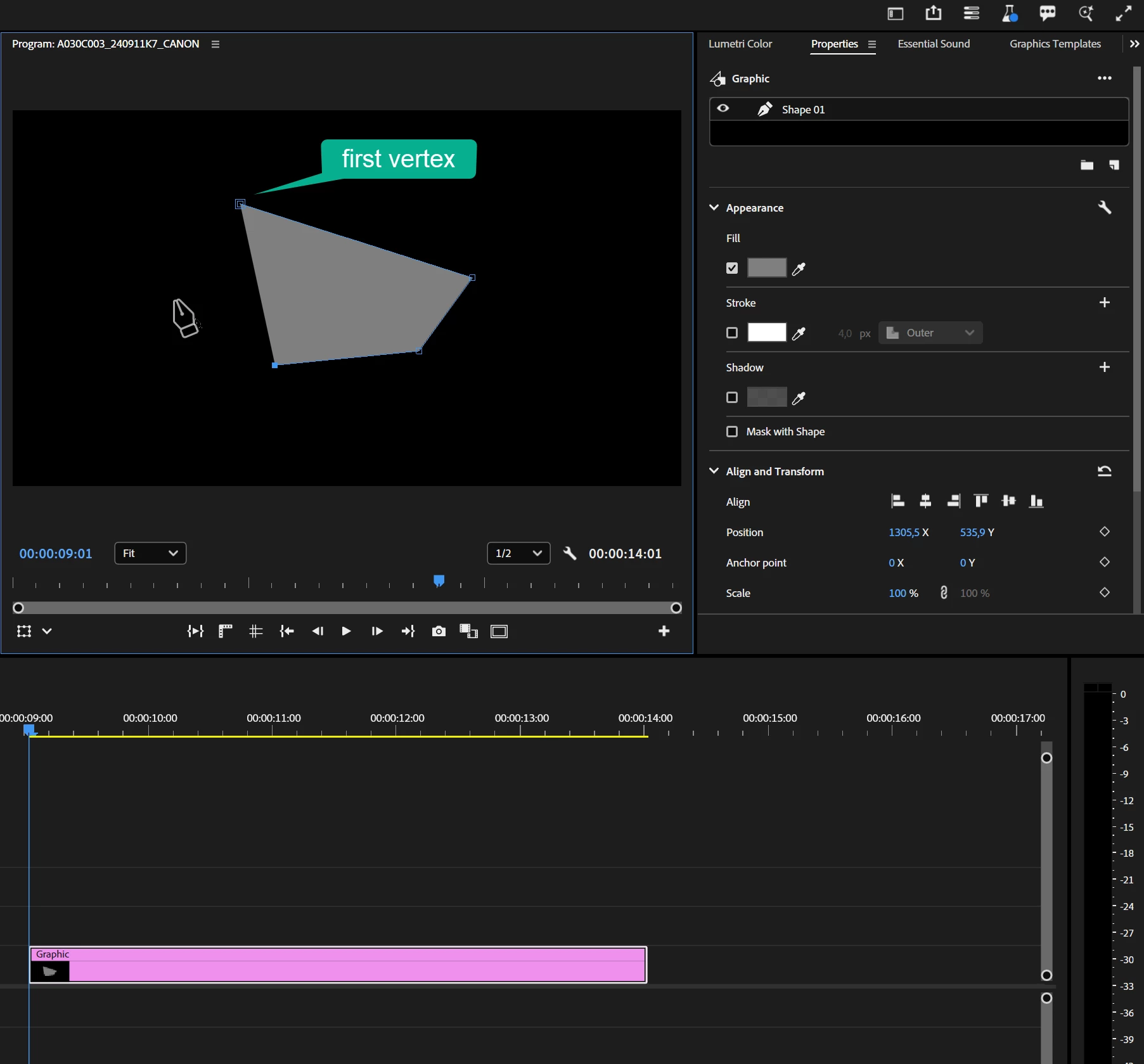 3 - I want to then place the second point and click again on the image but now it deselect Shape 01 and creates a new shape 01. I have to click on the shape layer in the effects panel to be able to place the second point.... again and again.