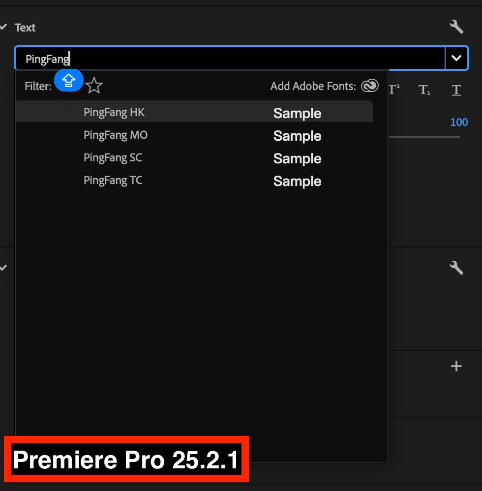 PingFang SC font is an original font of macOS system. Other fonts can be displayed in Premiere Pro, but Pingfang font cannot be displayed. I have tried to roll back to version 25.1, and this font(PingFang SC) can be displayed normally. I hope this issue can be fixed in the next version.