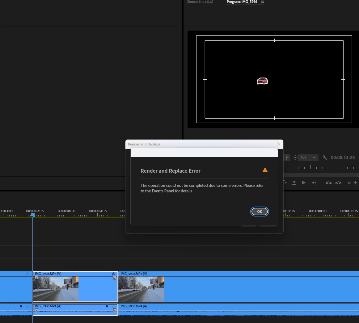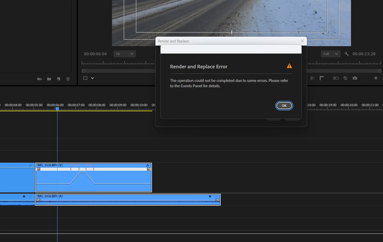 - take one clip and timeremap it. Try to render and replace. Result: