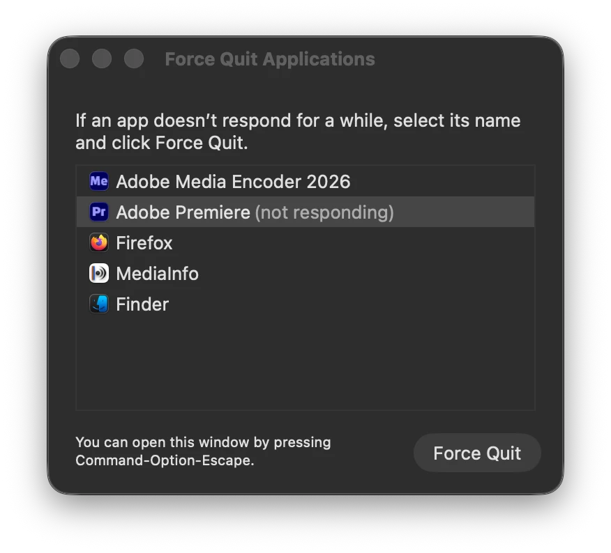 - Program Monitor freezes → Premiere becomes unresponsive → Force Quit