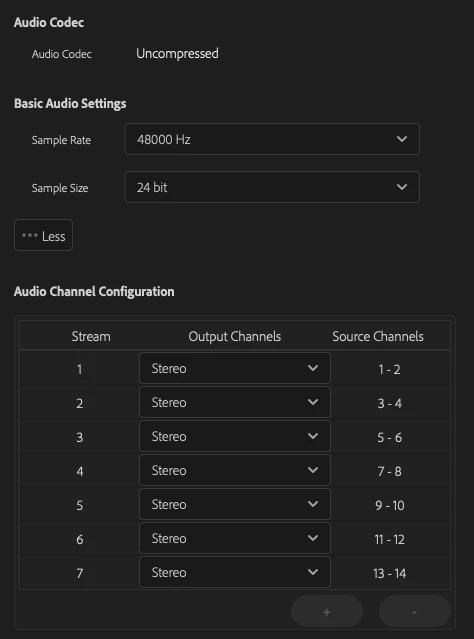 My timeline is 14ch (7 stereo pairs). and output needs to be prores 422HQ with 7 separate stereo pairs.