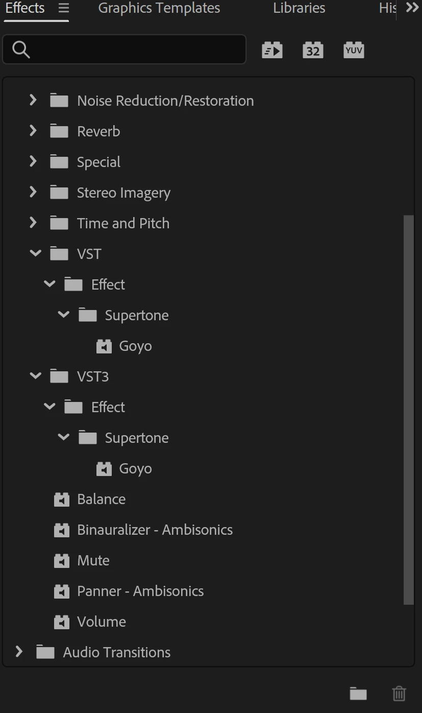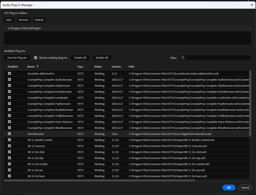 So you can see the program files VST plugins folder is included in the search. But Premiere Pro find nothing there, and shows only the VSTs found in the COMMON folder. I certainly can copy the plugin files there, but I don’t want to.