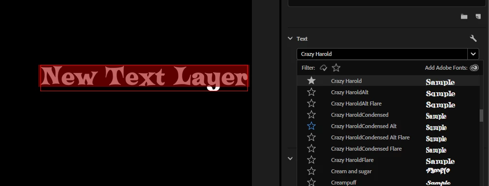 Adobe Premiere Pro freezes temporarily while bookmarking fonts from the font selection dropdown menu.
