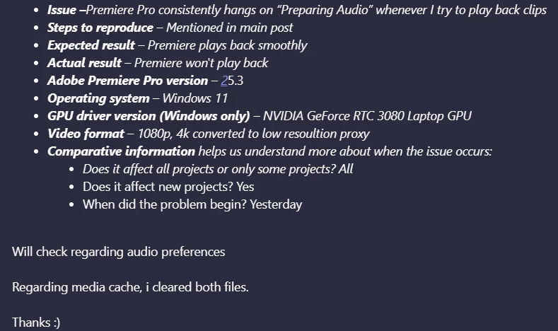 I’m running into a really persistent issue with Premiere Pro: whenever I hit play, it just hangs on “Preparing audio” for a long time and won’t start playback.
