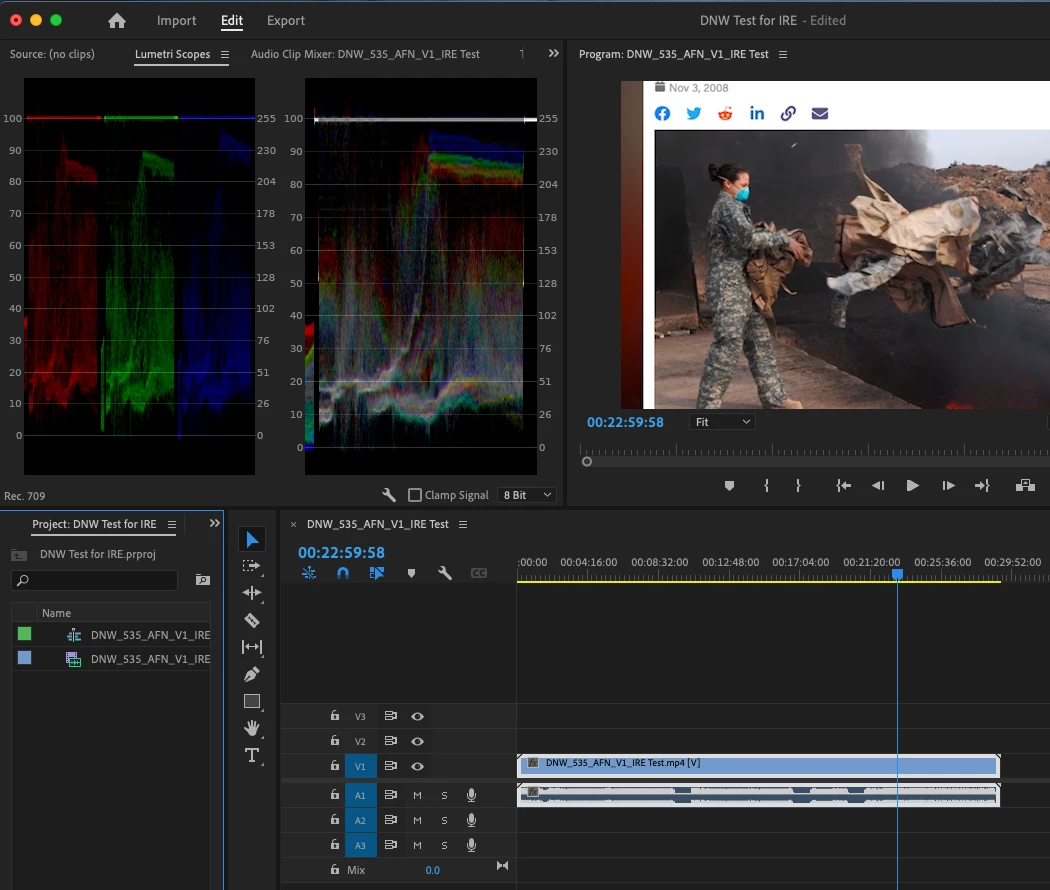 (The attached screen cap shows the IRE levels AFTER export using the video limiter — then re-imported into a blank Premiere timeline.)