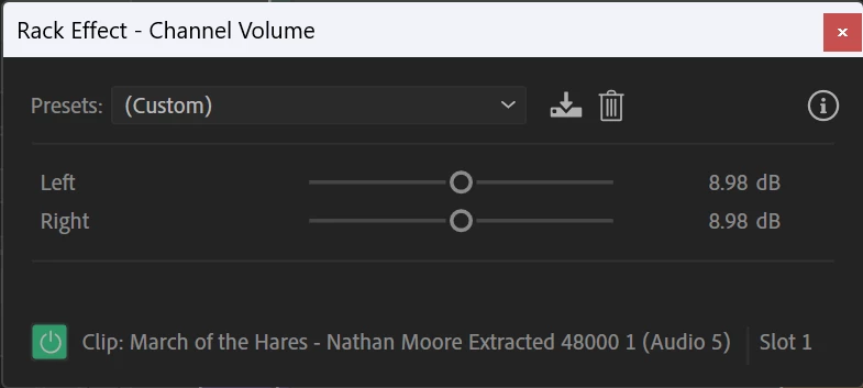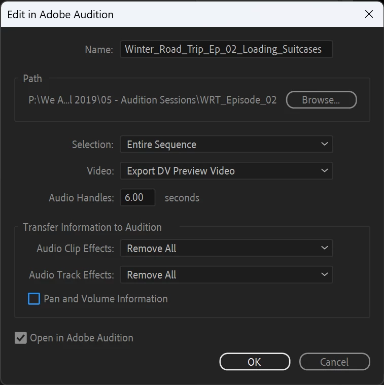 When I send an Adobe Premiere sequence over to Adobe Audition it is adding +9.0 dB of volume on Audition's yellow volume graph/line on each clip AND a clip effect on each clip, called Channel Volume, which sets each channel to +8.98 dB. The result is inaudable and burries the needles.