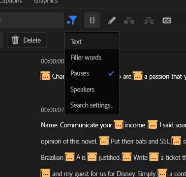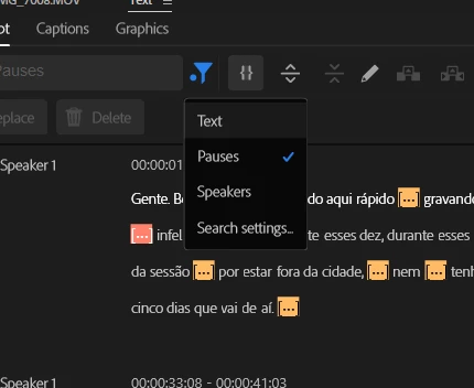 Quando o Premiere transcreve meus vídeos em inglês (idioma padrão), o botão Delete funciona normalmente — consigo apagar pauses e filler words sem problema.