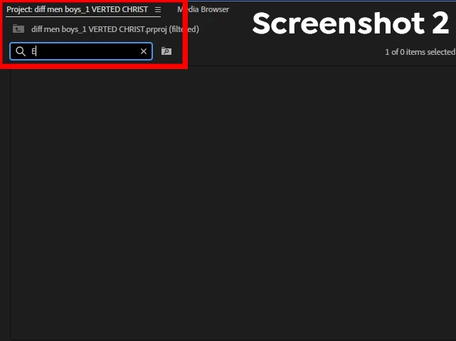 As you can see in photo's attached, I spent a really long time making this project, all for eventually the project to incur a bug, where I have 265 files in the project panel, and when needing to quickly nagivate to re-input/drag files into the project by simply typing a few letters to FIND the file, the search shows abosolutely NOTHING. Even typing ONE LETTER, completely shows ZERO SEARCH RESULTS.