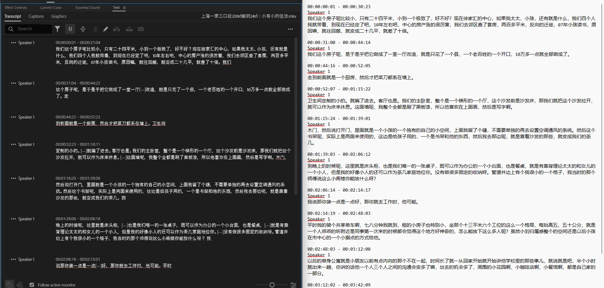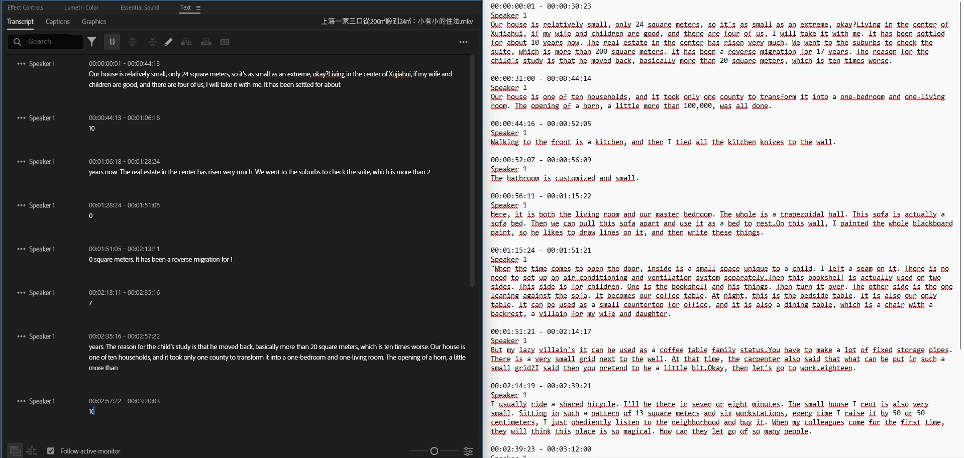 I got the corrected Premiere Pro transcript from my client - it retains all the original formatting done when I exported it from Premiere Pro. Now I import it back via the Import corrected transcript command and I see a total discrepancy between what I see in the text document and what Premiere Pro shows me: