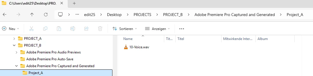 - The VoiceOver file is saved in project "B" /Adobe Premiere Pro Captured and Generated/Project "A"/VoiceOver.wav