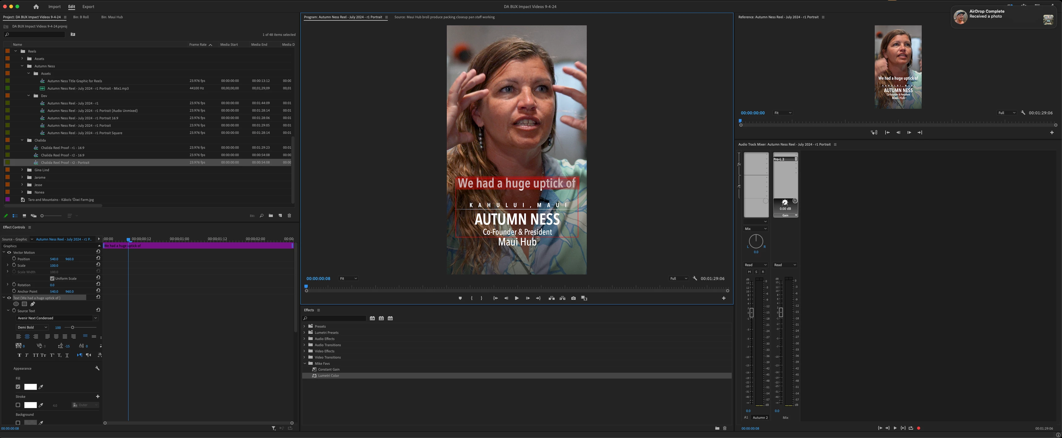 - Use the selection tool to double click the newly pasted text box in the program monitor so that the text in the text box is selected (highlighted red).