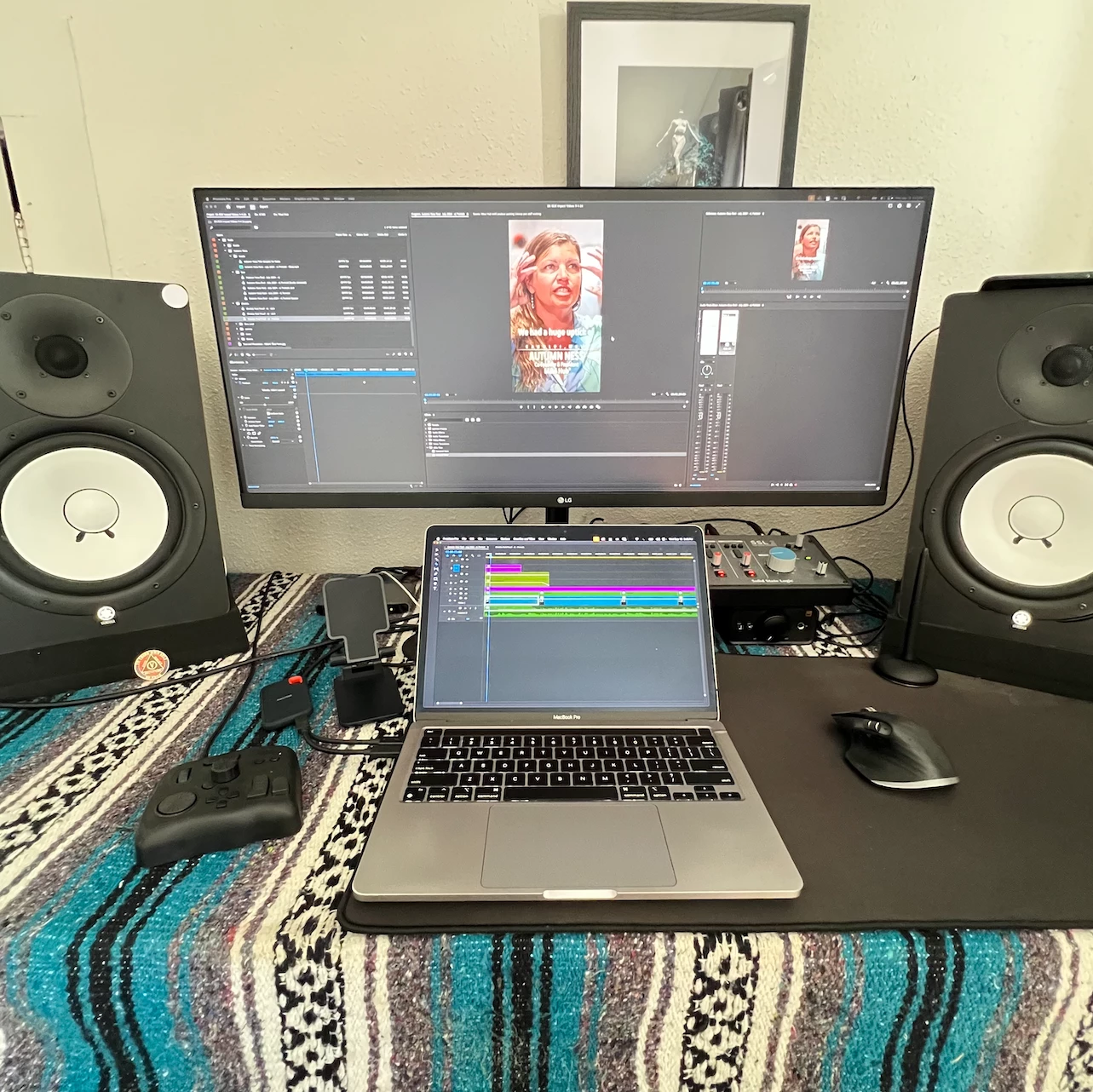 Using dual monitors with sequence timeline in laptop monitor and project dock, effects controls, program monitor, effects menu, additional program monitor, source monitor, and audio mixer in external ultrawide monitor.