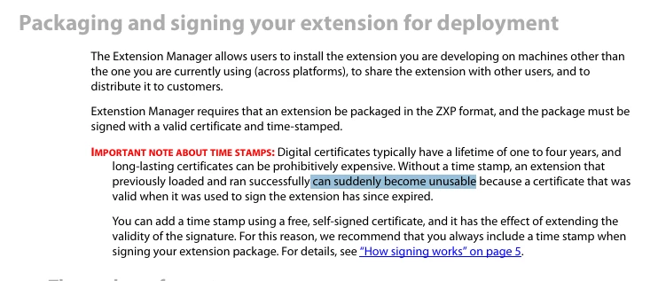 - Command that fails: ./ZXPSignCmd -sign "/Users/admin/Desktop/extension/dist/cep" "/Users/admin/Desktop/extension/dist/zxp/com.my.extension.cep.zxp" "/Users/admin/Desktop/extension/lib/.tmp/com.my.extension.cep-cert.p12" mypassword -tsa http://timestamp.digicert.com/