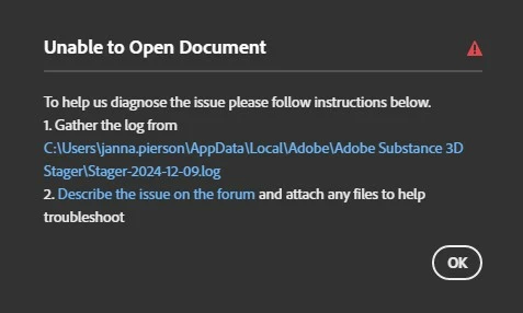 From simple to complicated scenes, I cannot open a single Stager file that I have created. I was working on these last week with no issues, all the way up to the end of the day Friday. This week I get nothing but error messages. I have verified that there are no updates needed for system, drivers or Stager itself. Attaching log file as requested in the error message.