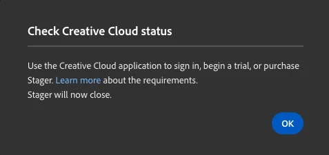 Every time I open Stager, I get the splash screen, then it tells me it's going to close because I need to install the app via the Adobe Cloud app (which I've done...multiple times).
