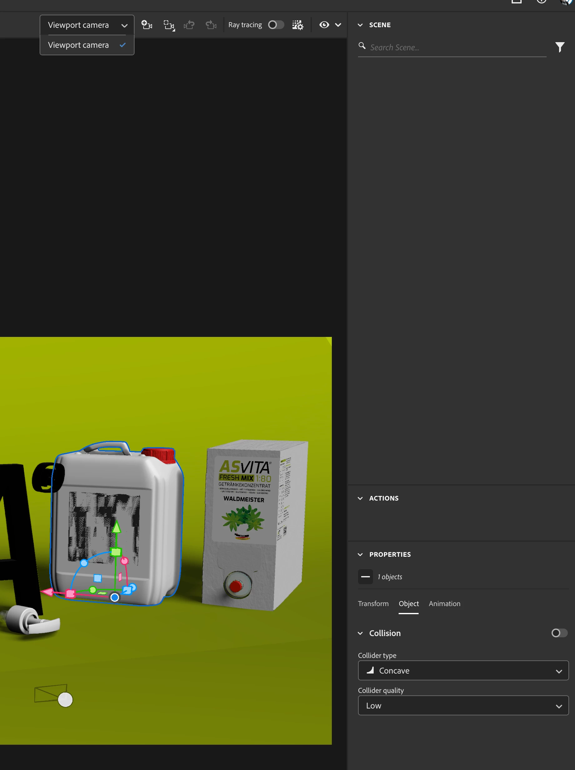 Scene assets are visible in the view port but not on the right side, where I normally see all assets and cams.