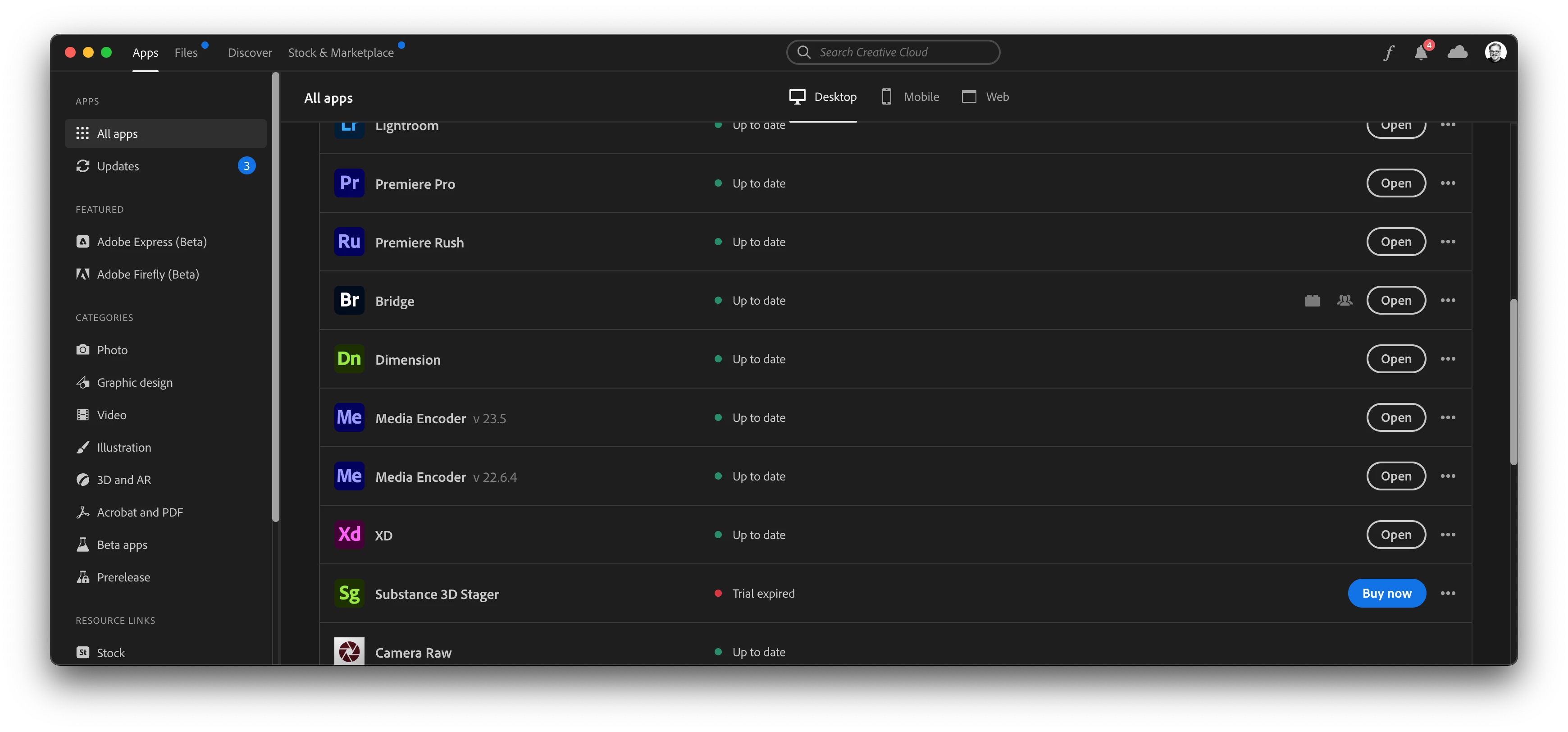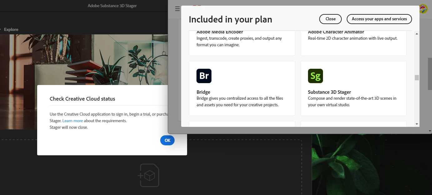 Substance 3D Stager keeps showing "Check Creative Cloud status" even it is included in my plan.