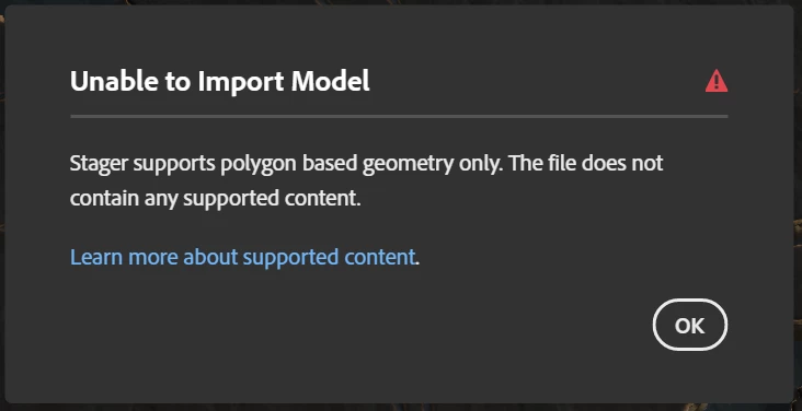 However, when using Stager for mocking up 3D scenes, any PNGs, JPGs, OBJ, FBX (and probably more) will not open directly from the box client. On our end, it's the same as importing a file from our local files in the explorer (it looks the same, too). But Stager will refuse to import, giving an error message "There was a problem reading the file" or "UNABLE TO IMPORT MODEL: Stager supports poygon based geometry only. the file does not contain any supported content."