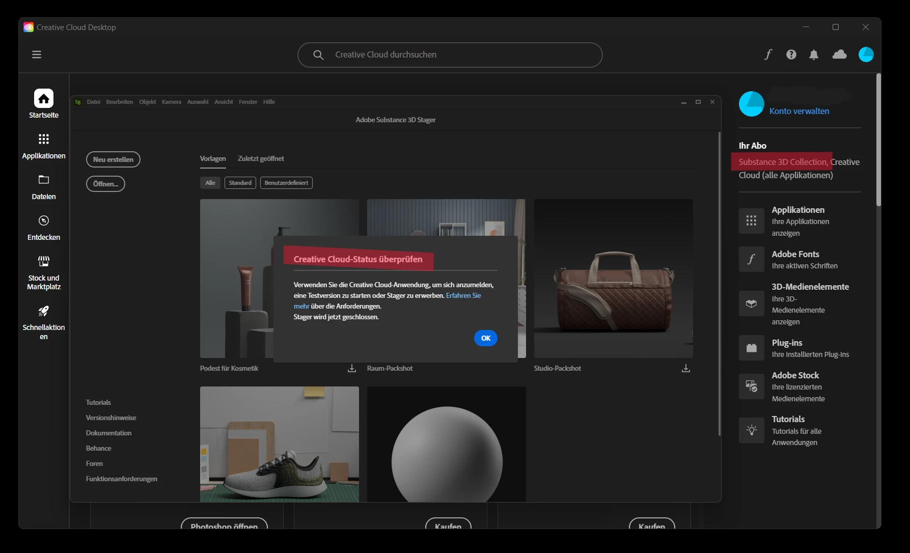 Ich habe gerade die Testversion von Substance 3D abgeschlossen. Kann es aber nicht nutzen weil jetzt mal beim öffnen ein Fehler kommt dass ich mich dich anmelden soll...