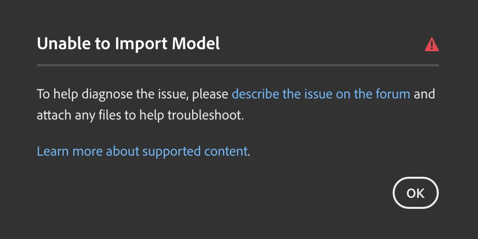 I have a USDZ file that is only 33.8MB that images fine on my Mac in Preview and QuickLook, but when I try and import it into Stager, after it thinks for a few seconds, and the progress bar is about half way through, it pops up a dialog saying it can’t import it and report it here;