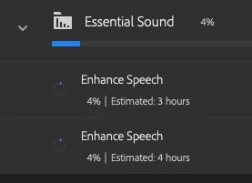 Yea - this is a nightmare. I have tried a few of the solutions suggested and still get no improvement. Working with a 50 min interview - and enhancing the speech is now cue'd to take 3 - 4 hours! (see below) My solution is to export the audio, then uploading to the Adobe Podcast / Speech Enhance tool - let that do the enhancing (in a matter of minutes) then bring it back into my project.