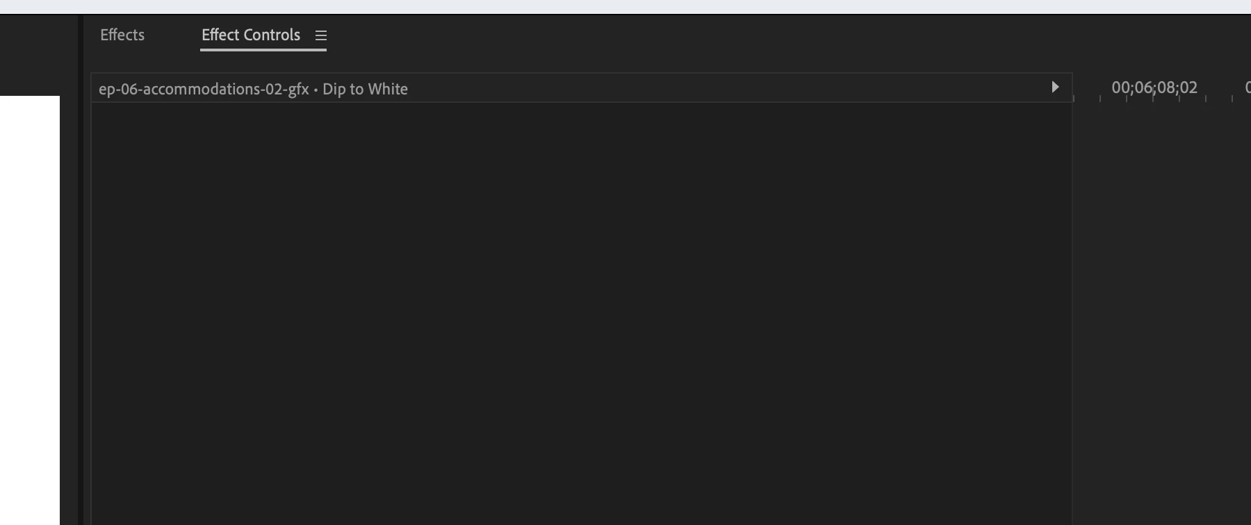 Dip to White selected in timeline. Until sometime last week the selection would show up in Effect Controls with options to change duration and Centered on Cut etc. Now it's just showing the name of the transition with no options. However if I select a video or audio clip the controls are visible and adjustable.