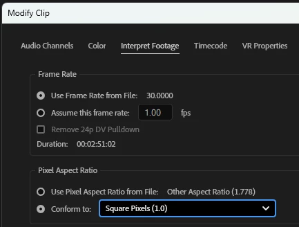 If I tell Premiere to re-interpret the footage, specifying square pixels, then everything looks right: