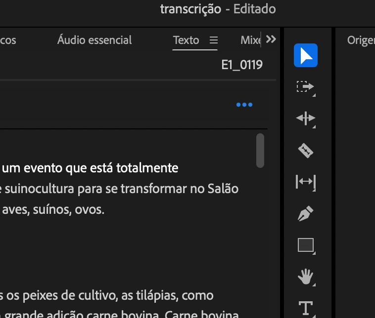 O painel da ferramenta de transcrição não abre as opções de exportação no botão "..."