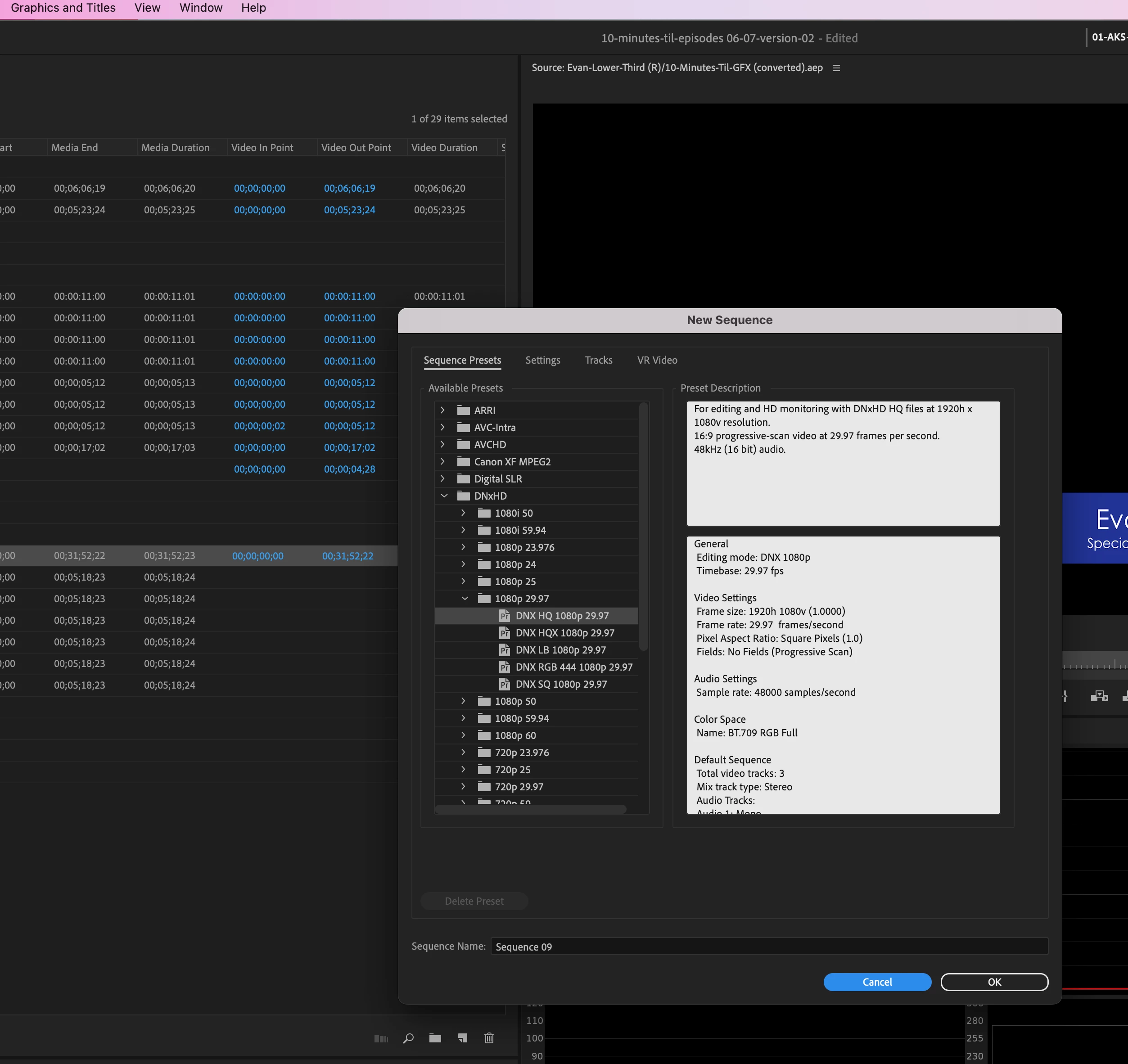 Created new sequence by dragging clips to lower-right icon. Desired automatic sequence was created but an additional New Sequence dialog opened. Clicking on Cancel or OK did nothing so I had to Force Quit.