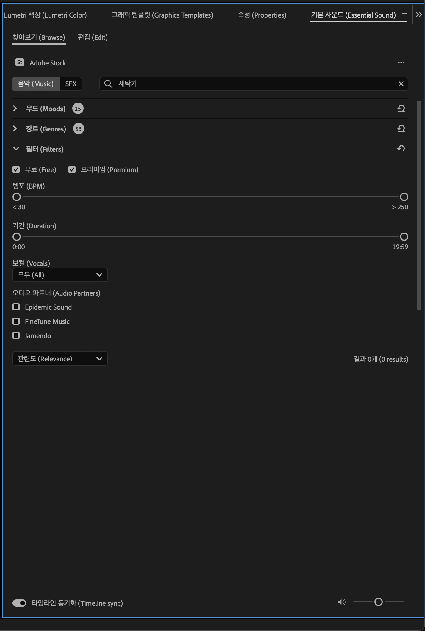 No results were found that match the filter criteria in the Essential Sound panel