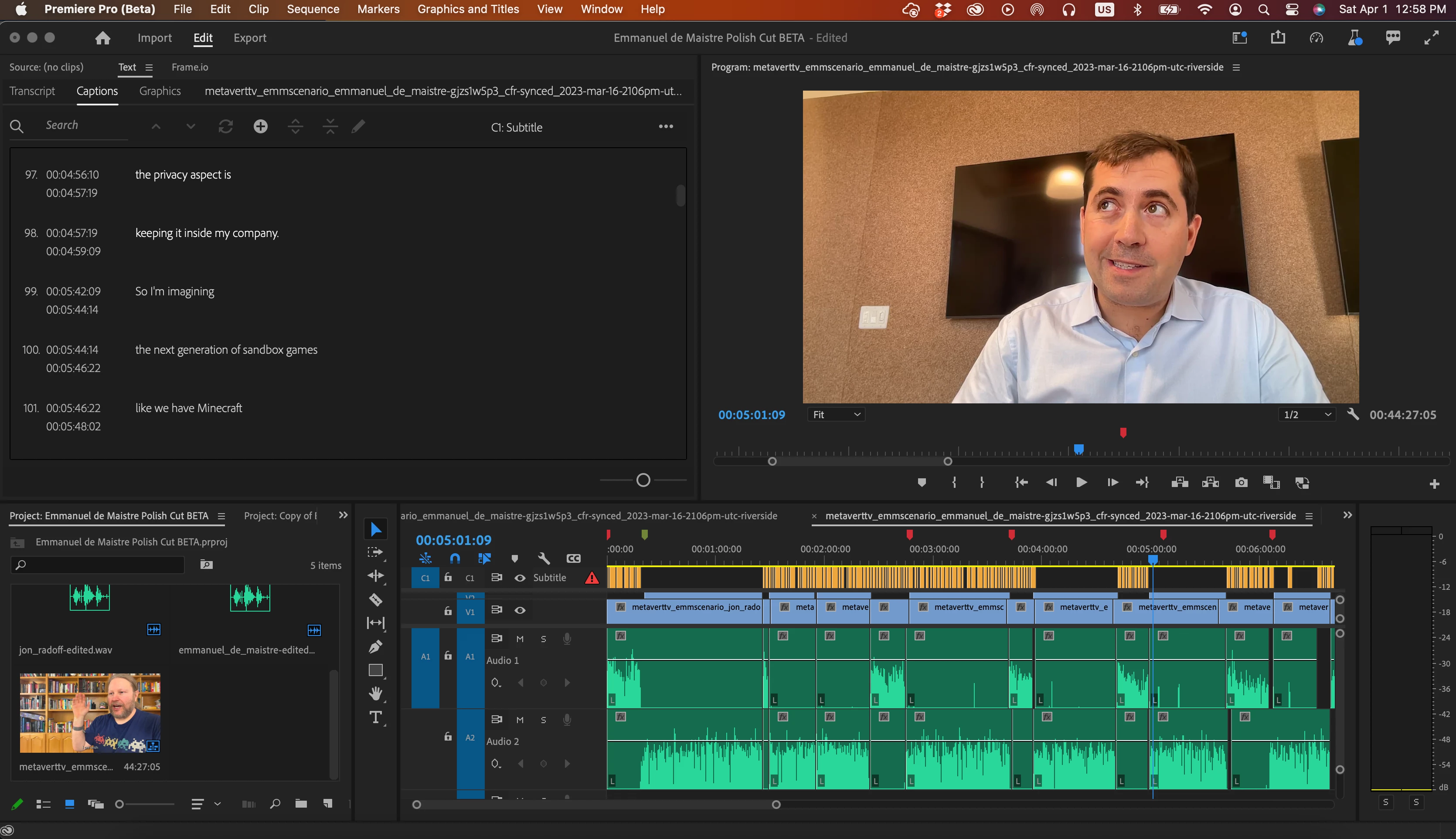 I finished my rough cut and made a transcript. Then I made captions. This revealed that one of the speakers is missing from the transcript some of the time.