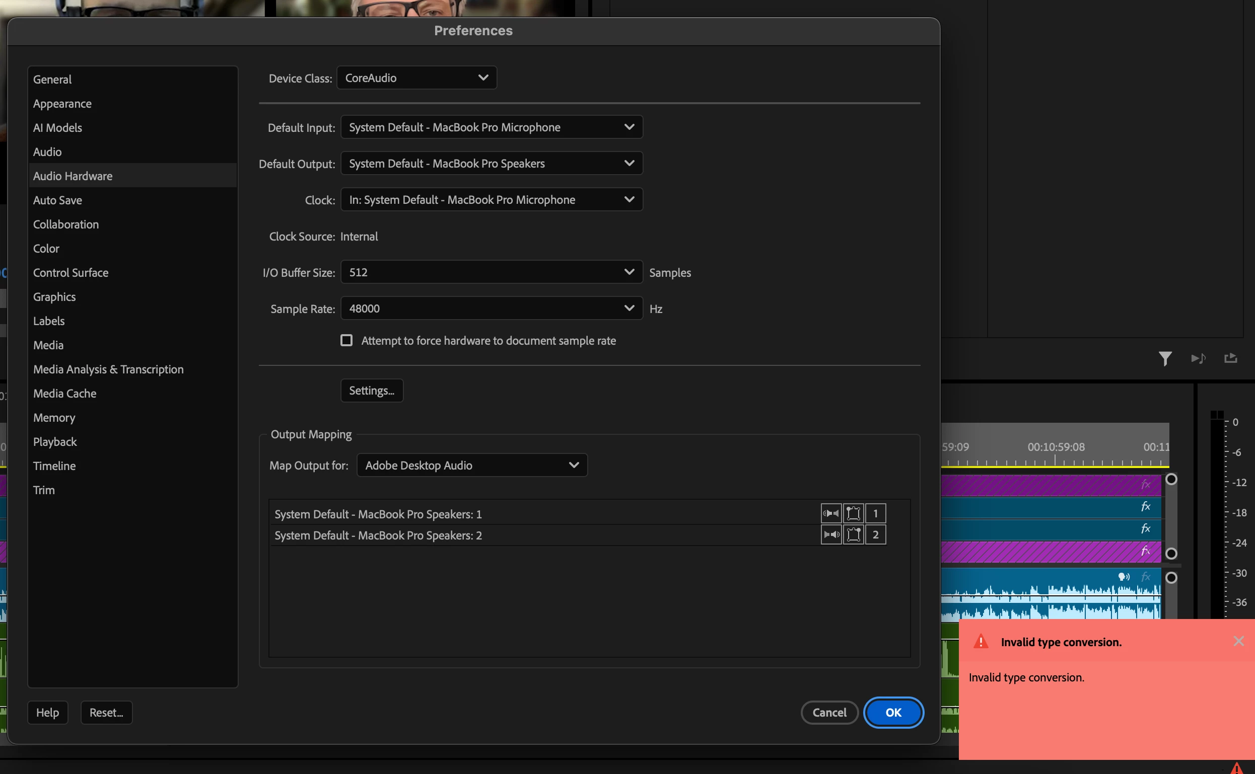 premiere pro beta audio hardware change error