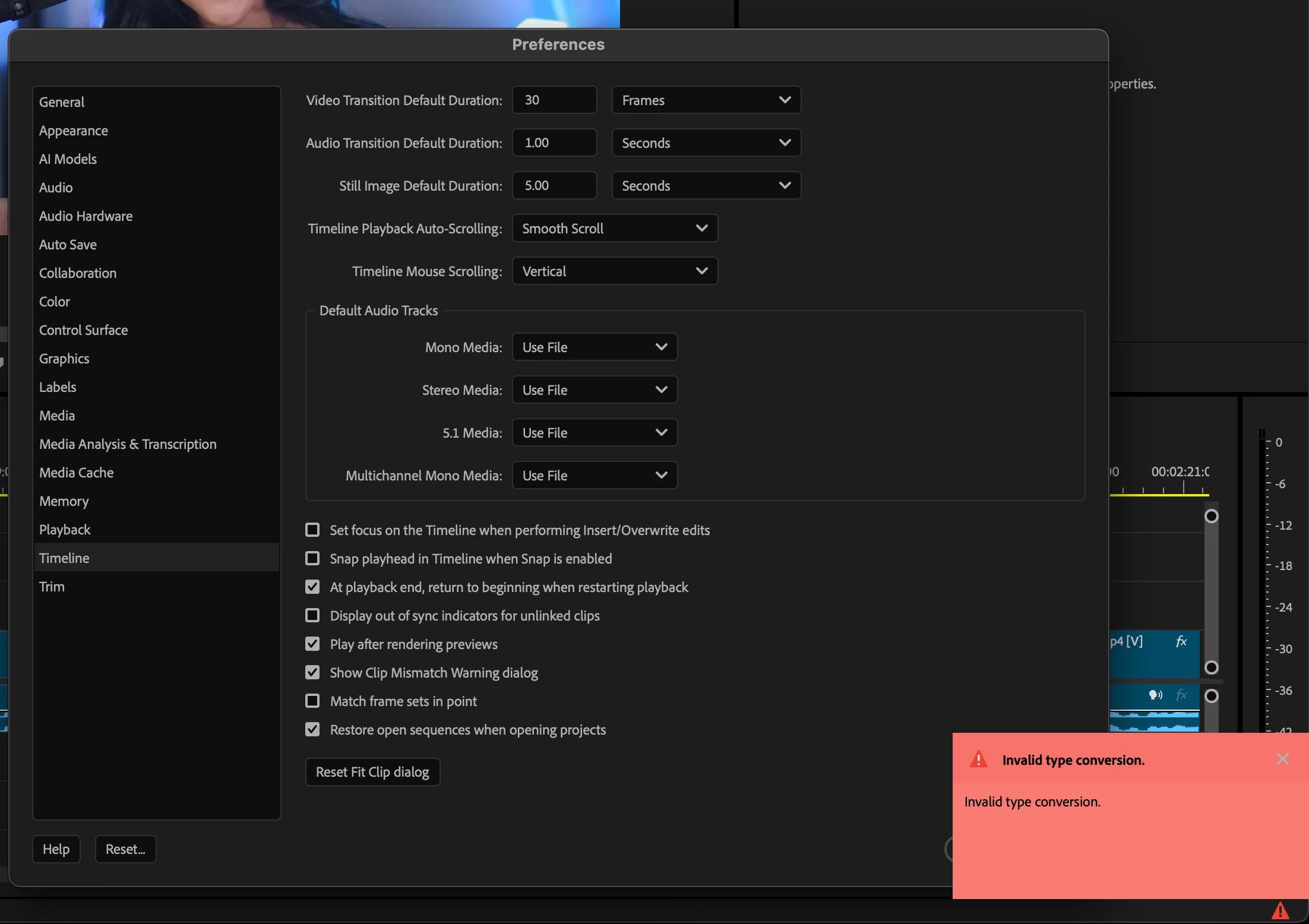 I am unable to change the Timeline Playback to other than the default option.