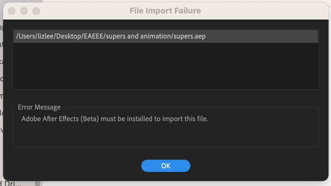 LLiz27396316tuouParticipantForum|Forum|2 years agoJune 12, 2023Premiere Pro cannot import AE fileForum|Forum|2 years agoJune 12, 20230 replies92 viewsHi, recently I installed the beta ver of Premiere Pro, and today I tried to import AE file, and it failed. The error message said AE(Beta) must be installed, and then I installed, but the problem still exist~ Error