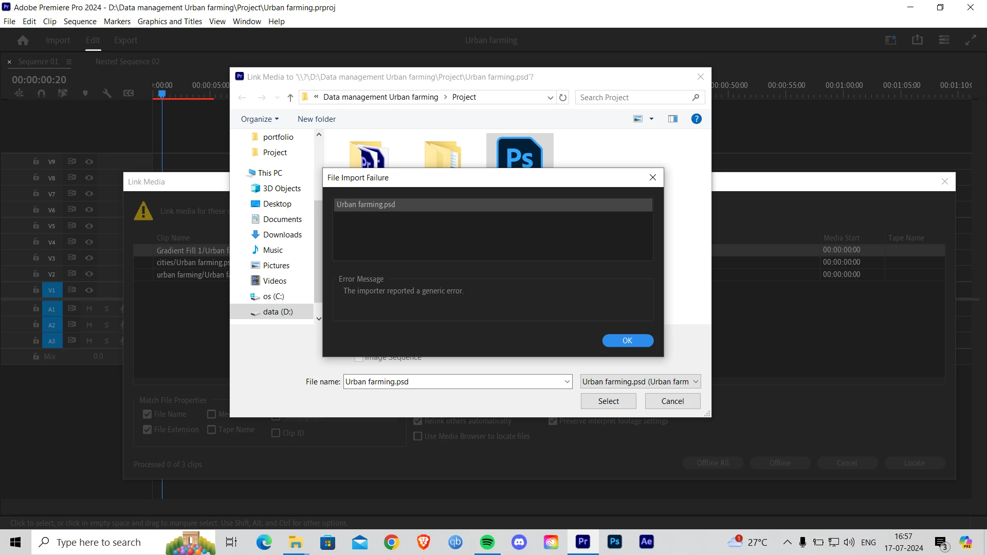 The importer reported a generic error, trying to link media.