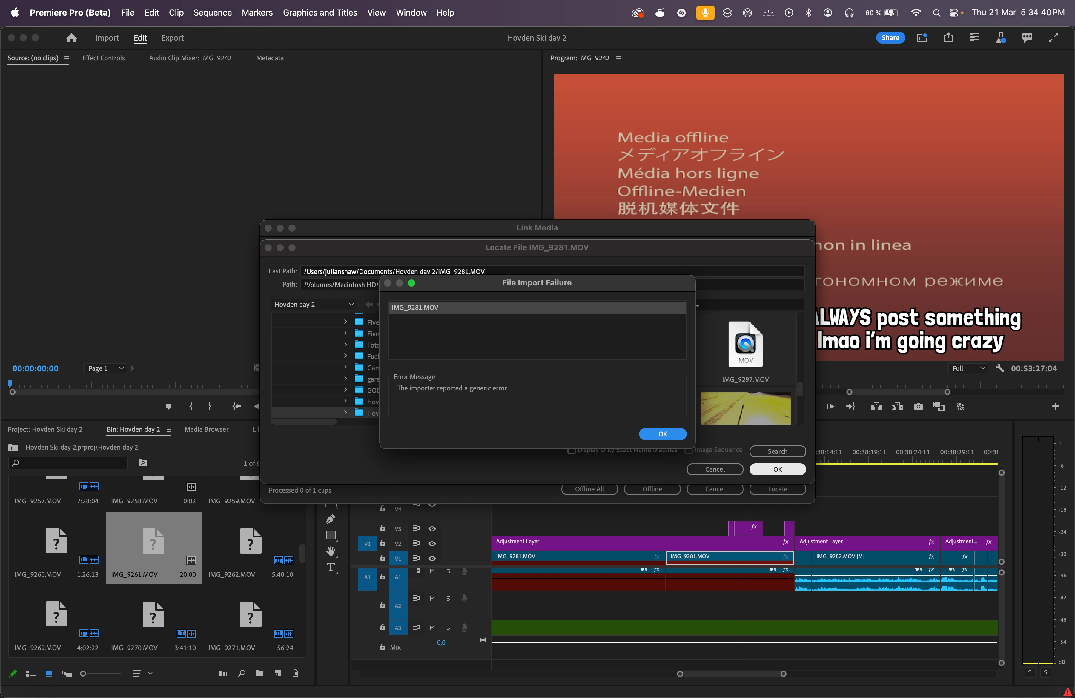 So I was just restarting premiere pro like i usually do and when i came back 97% of clips in the seqeunce were gone but still in the Bin (not in the project, i know, i have no idea how they ended up in the bin, i didn't choose it) so i tried to link the media, it found the missing video file and then i tried to click ok, then it just said the importer reported a generic error, COME ON IT EVEN FOUND THE ORIGINAL FILE!!! this is really annoying me and i can't lose this project (image below is an example