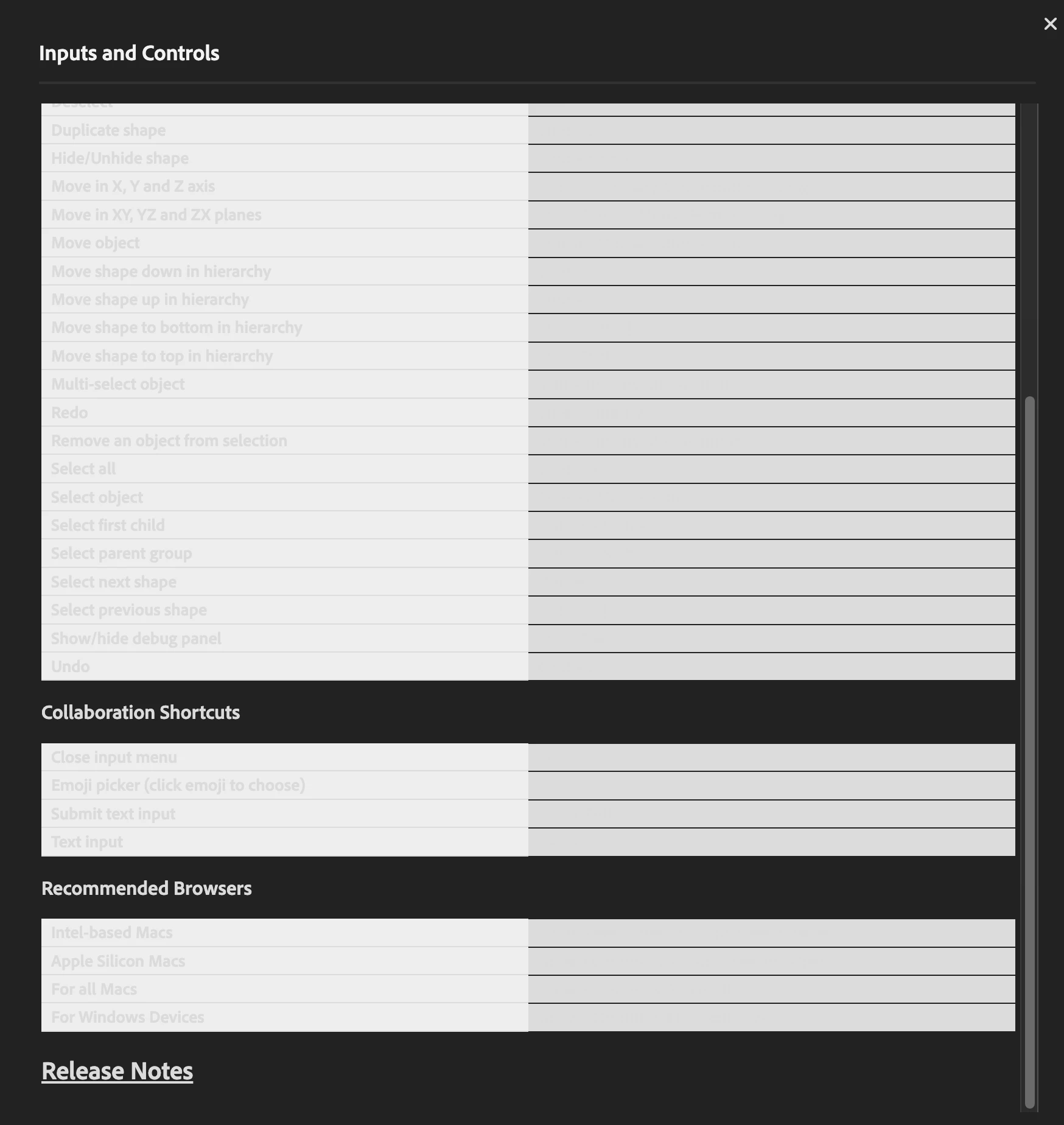 - Expected result and actual result: Expected result is legible text in the "Inputs and Controls" modal popup. Actual result is barely visible or invisible text due to a dire lack of contrast between the text and background colors.