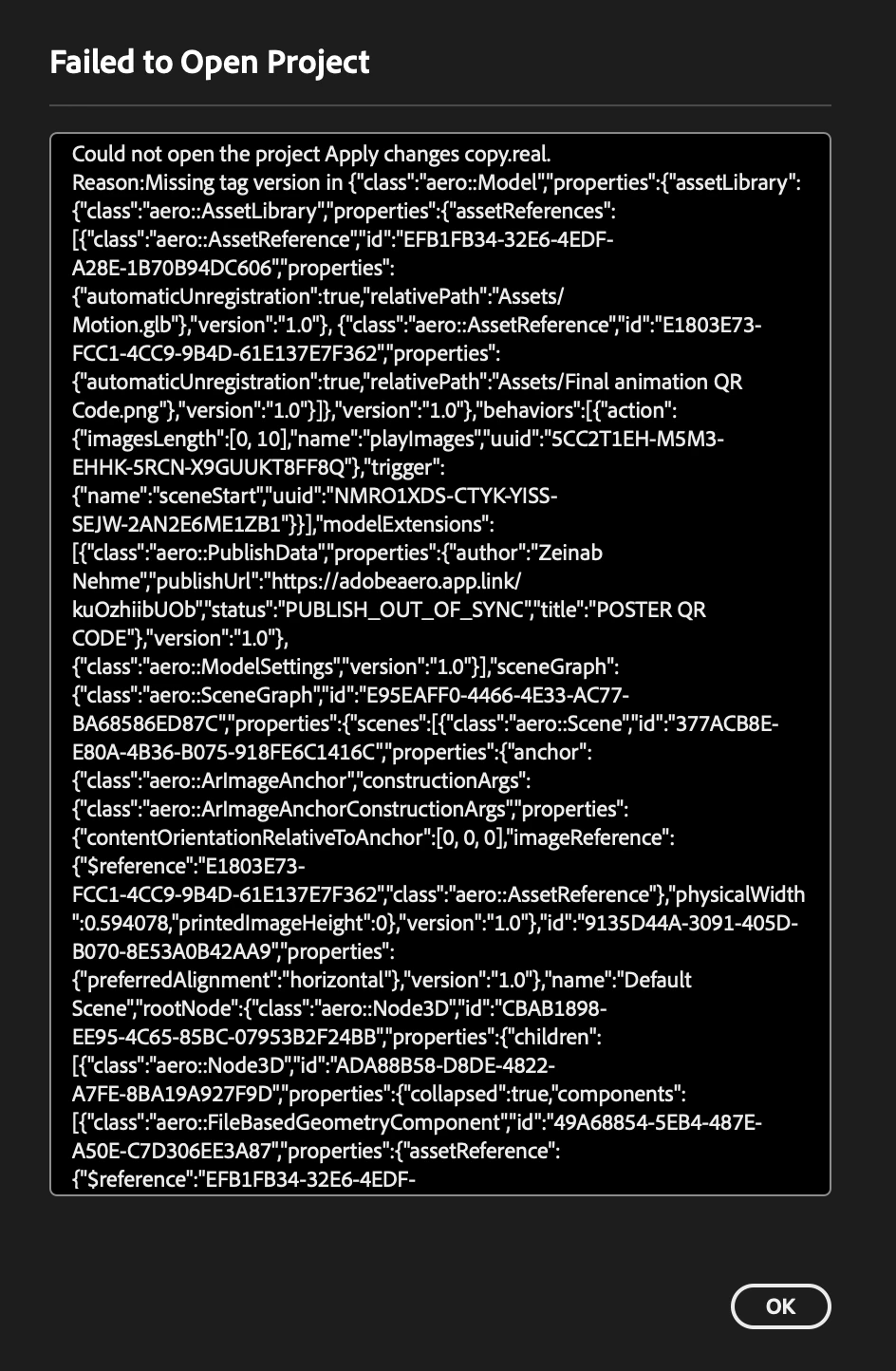 Hello Adobe Aero i am facing an issue on Adobe Aero which is i need this specific document because i want to apply changes on my QR code but suddenly this document crashed and stopped working. When i click on the document its either they give me a description that someone else is using this document even though no one is and then they keep saying failed. What should i do that is the solusion to this problem. Please reply ASAP and thank you.