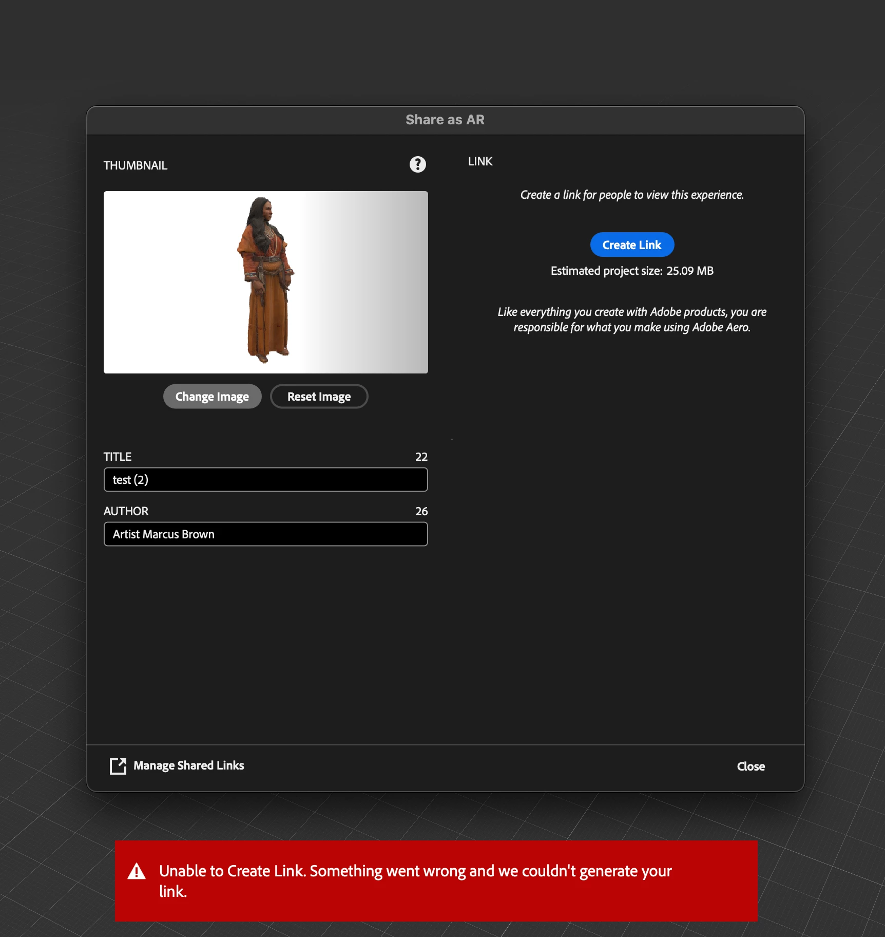 I've spent a good amount of time building a scene in Aero (desktop), and tested it earlier today with a link generated in the desktop app. I tried again later today when more was complete, but no links are being generated. I've created duplicates, logged out, logged in under personal profile then opened .real file, but nothing has worked. How can I generate a link again??