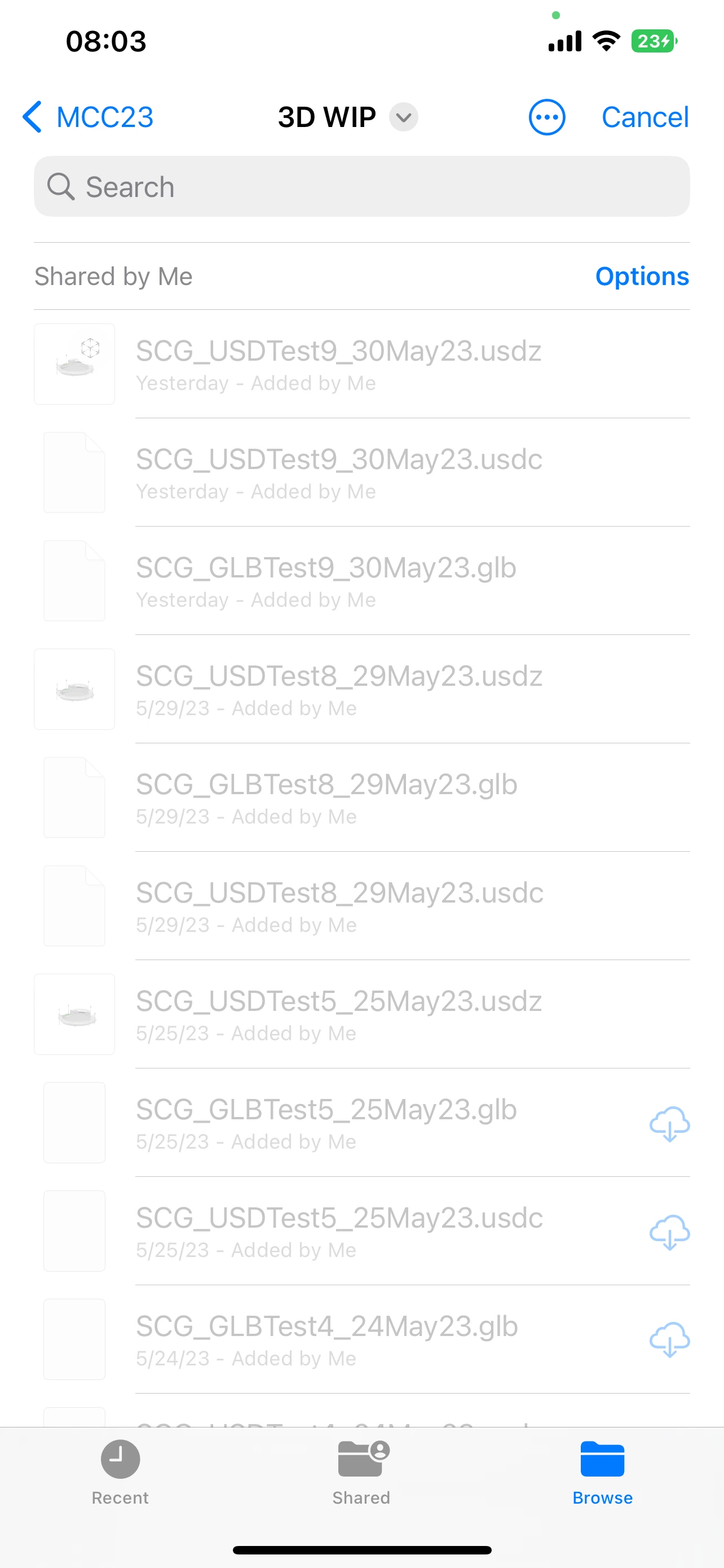 On iPhone 12 Pro Max aero app - downloaded glTF file and saved as .glb ... when pressing "+" (whether from on phone or iCloud) files show but as disabled (not clickable or importable). So no .glb can be imported to a new scene or a current scene.