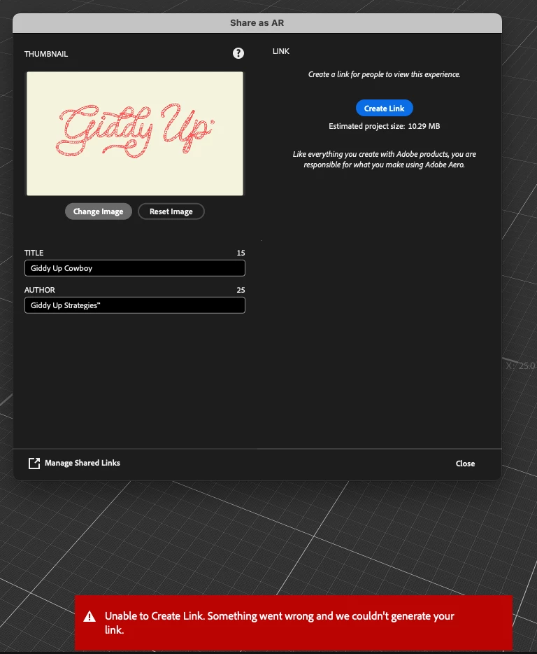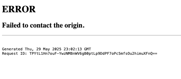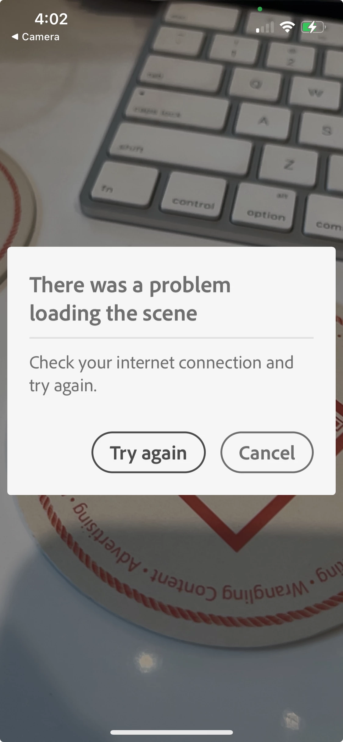 Issue loading scene: "There was a problem loading the scene" Check your internet connection and try again. Upon further investigation, my internal link manage file says: ERROR Failed to contact the origin. Generated Thu, 29 May 2025 22:55:47 GMT Request ID: 8f-s3LXlND0ybMS6wiXHdNd90M8fL14uXWVLM98vPHD3Y0-9fxV4AQ== This is for my AR that has worked consistently for the past year, 1000x.